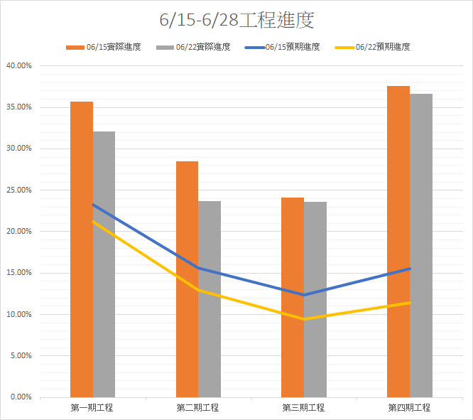 | 6月22日 | 第一期工程 | 21.20% | 1.排水溝工程 2.各管線預埋工程 3.共同纜溝施作 4.人行道緣石施作 5.高壓混凝土磚施作 |