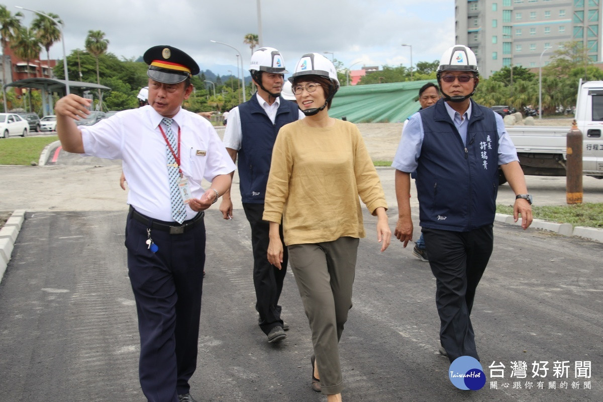 饒縣長視察後對工程進度表示滿意,感謝建設處團隊及各施工團隊的辛勞,及台鐵及各管線單位的配合,更感謝鄉親體諒施工造成的不便,希望透過這個計畫,用一年的時間,徹底改造這個台東的大門,整合全區視覺景觀,帶動觀光、經濟、交通共同發展。
