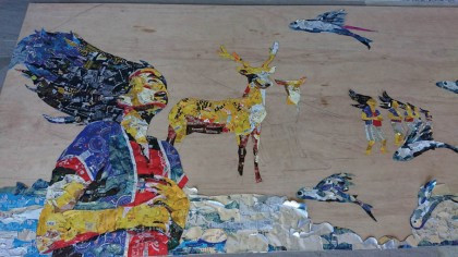 為美化臺東火車站週邊景觀,釘畫藝術家胡達華與臺東女中美術班師生合作,運用廢棄鋁罐攜手創作長十八公尺、寬一.二公尺的巨幅釘畫作品,呈現臺東六個原住民族群的文化特色,未來將置於車站道路周邊牆面,讓遊客感受原民風情。